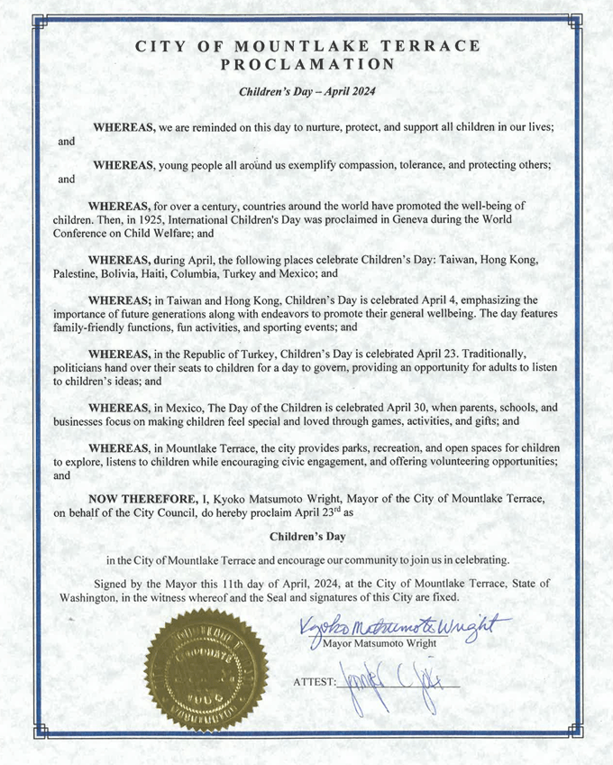City of Mountlake Terrace Proclaims April 23rd as Children’s Day
