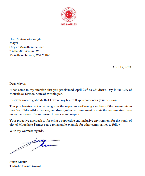 Following the event, the Turkish Consul General from Los Angeles sent a letter of appreciation to the City of Mountlake Terrace, thanking the community for recognizing and honoring Turkey’s Children’s Day. The Consul General expressed gratitude for the city’s commitment to cultural exchange and for fostering a sense of connection between Turkish traditions and the broader Mountlake Terrace community.